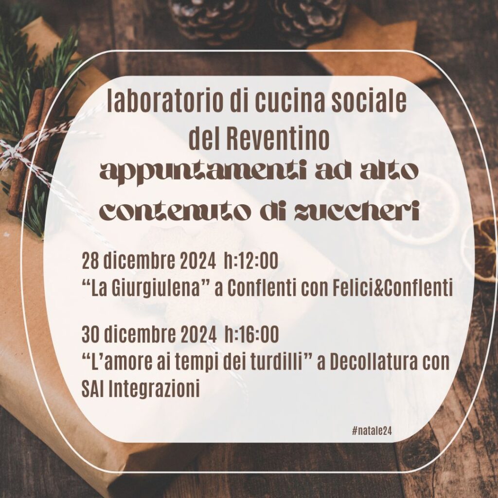 Giorno 30 dicembre 2024 invece, alle ore 16,00, il Laboratorio di Cucina Sociale del Reventino ha programmato la presenza a Decollatura per la seconda edizione de “L’amore al tempo dei turdilli”, altro itinerario sulle strade della dolcezza.