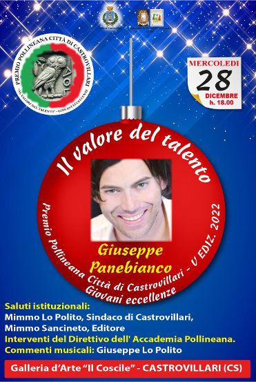 La cerimonia di premiazione del premio Pollineana “Il valore del talento” si svolgerà il 28 dicembre 2022, alle ore 18:00, presso la Galleria Il Coscile di Castrovillari. Giuseppe Panebianco riceverà il premio simbolo dell’Accademia Pollineana: la civetta realizzata in pietra leccese dal Maestro Angelo Cherillo. All’evento parteciperà il direttivo dell’Accademia, il sindaco di Castrovillari, Domenico Lo Polito, l’editore Mimmo Sancineto e Giuseppe Lo Polito, al quale sono affidati gli intermezzi musicali.