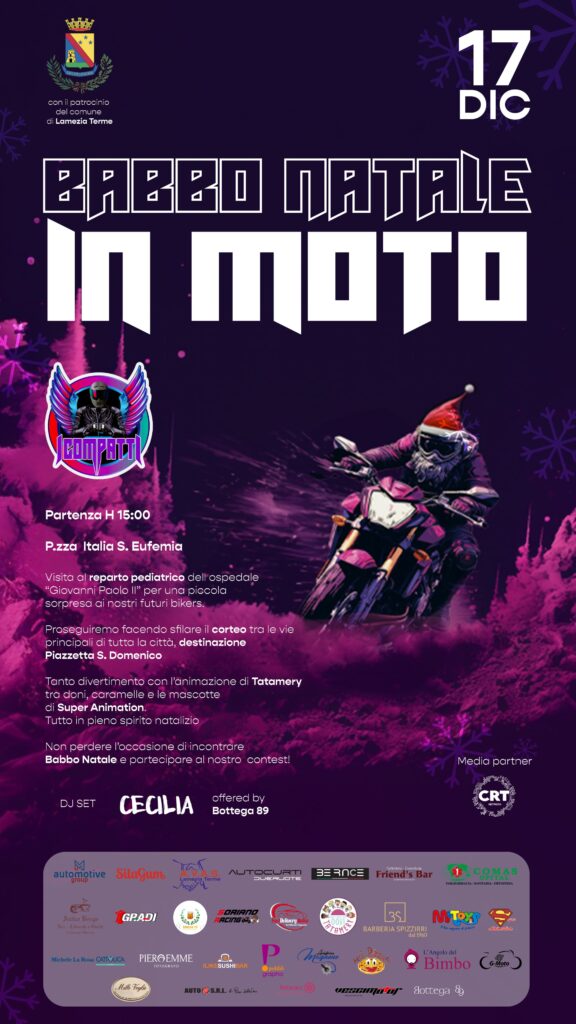 Prosegue con grande entusiasmo e iniziative solidali di grande impatto sociale, l’attività dell’associazione lametina “I Compatti”. In occasione del Natale 2023, infatti, questo vulcanico gruppo di motociclisti, aggregatisi spontaneamente nel dicembre del 2020, ha organizzato per domenica 17 dicembre, una passeggiata per le vie principali della città, denominata “Babbo Natale in moto” partendo da Piazza Italia.