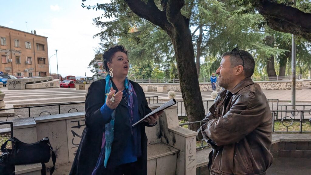 Siamo nel quartiere San Leonardo, in quella parte di Catanzaro che, una volta, era considerata tra le più nobili e culturalmente più evolute della città. Siamo all’interno dei giardini, ogni tanto appare dal cielo velato un pallido sole e, naturalmente c’è il vento. Immancabile.