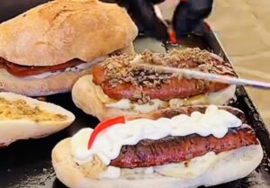 Poi sono andato nell’area food e ho cominciato con un panino straordinario con salsiccia, caciocavallo Silano e funghi rositi.