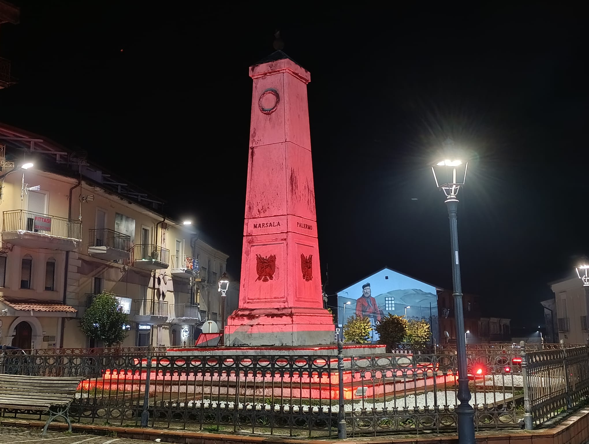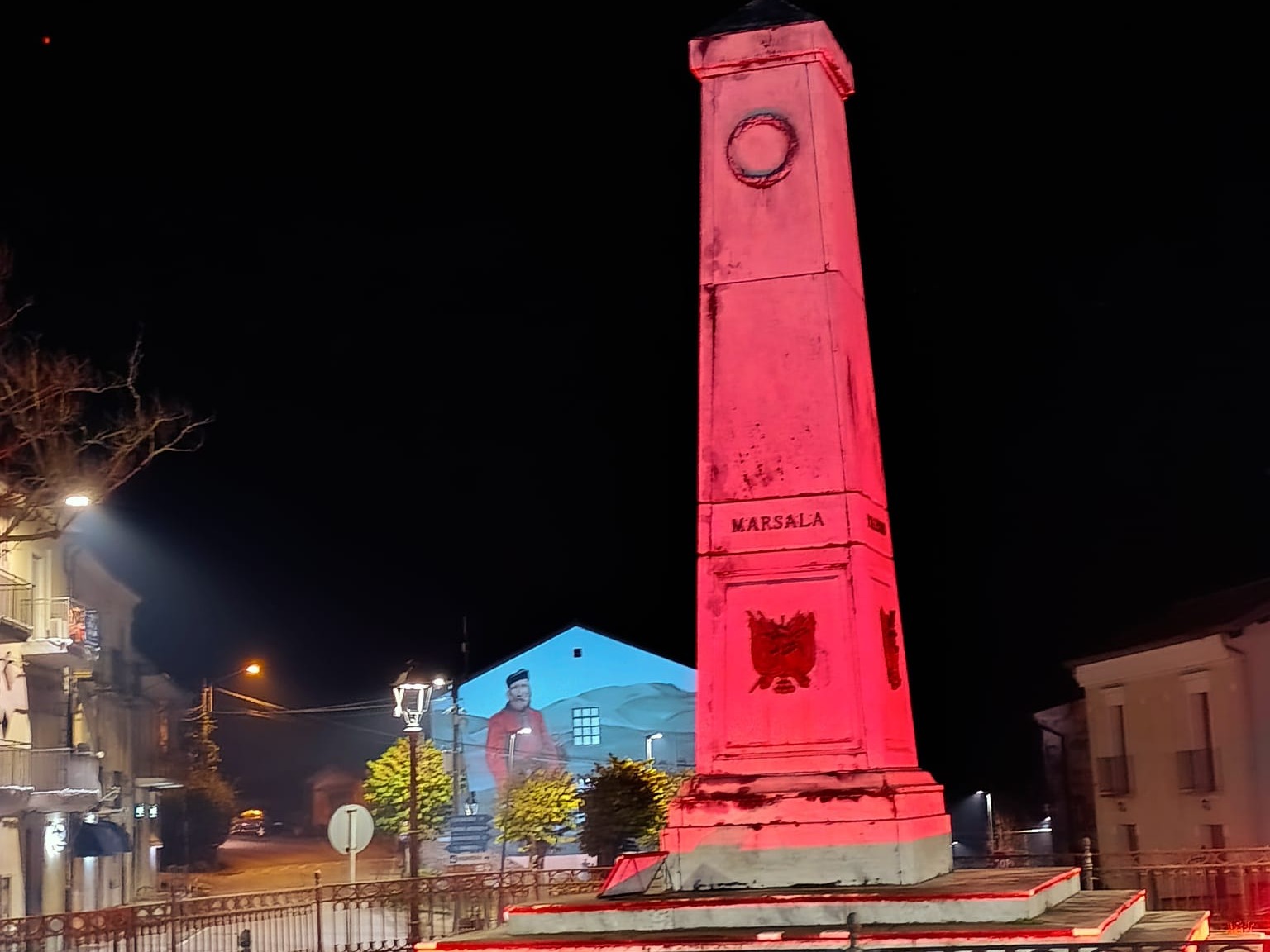 La stele di Garibaldi illuminata di rosso, con sullo sfondo ben visibile anche il murales che ricorda Garibaldi in camicia rossa, è solo un segno, ma importante per non dimenticare e per educare una generazione sensibile al problema e dunque migliore.