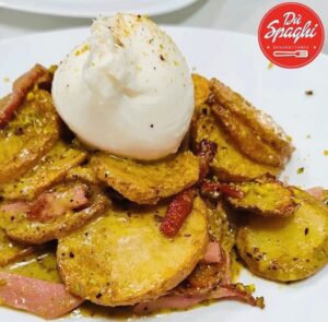 Oggi voglio raccontarvi del mio “momento di gusto” con una fantastica porzione di patate silane abbinate con il pistacchio e mozzarella di bufala. Questa delizia potete degustarla da “Du’ Spaghi” a Quattromiglia di Rende. Appena è arrivata già mi veniva voglia di mangiarla, si presentava proprio invitante. Le patate sono tagliate a fette, poi una calata di pistacchi e cubetti di mortadella croccante e sopra una fantastica mozzarella di bufala.