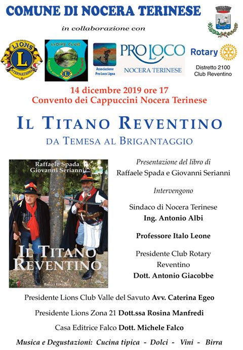 L’incontro è programmato a Nocera Terinese, il 14 dicembre 2019 alle ore 17,00, tra le antiche mura del Convento dei Cappuccini, a cui interverranno il sindaco di Nocera Terinese, Antonio Albi, il professore Italo Leone, la presidente del Lions Club Valle del Savuto, Caterina Egeo, la presidente del Lions Zona 21, Rosina Manfredi, il presidente del Club Rotary Reventino, Antonio Giacobbe, la Pro Loco Ligea e la Pro Loco Nocera Terinese, e per la casa editrice Falco, l’editore Michele Falco.