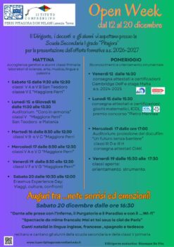 La Settimana di Open Week si concluderà il 20 dicembre con il primo Open Day, momento conclusivo di incontro e condivisione con le famiglie. Dulcis in fundo: sabato 20 dicembre alle 16:30, nell’auditorium della scuola media Pitagora si terrà lo spettacolo “Dante alle prese con l’Inferno, il Purgatorio e il Paradiso e con il wi fi” che vedrà in scena i ragazzi delle classi quinte e della scuola media. Seguirà la performance dal titolo “Spectacle de mime francais: moi et toi sous le ciel de Paris”.
