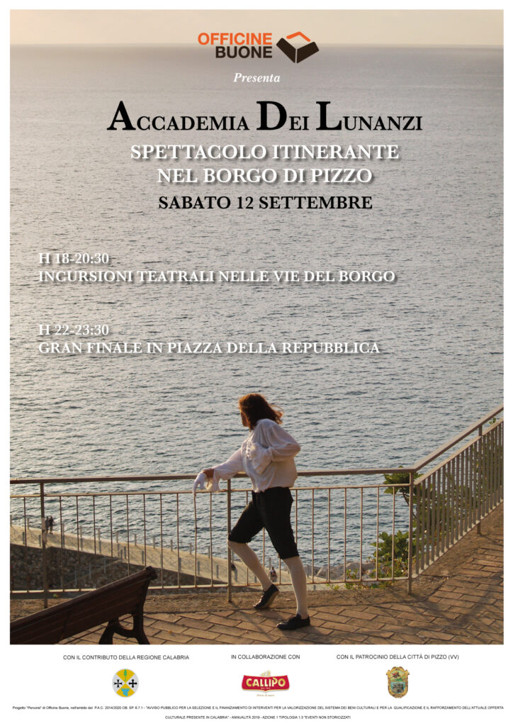 Il 12 settembre infine, a partire dalle 18:00, saranno messi in scena una serie di spettacoli itineranti per il centro storico di Pizzo. «Un progetto – come spiega Ugo Vivone, fondatore di Officine Buone – che innova il concetto di “guida turistica” e lo trasforma in un “turismo esperienziale”, modalità sempre più efficace per conoscere al meglio la vera essenza dei luoghi. Abbiamo unito in questo progetto due eccellenze del territorio calabrese: il gruppo Callipo, da sempre vicino alla nostra missione, e la bellezza dei luoghi di Pizzo, che saranno raccontati in maniera innovativa da Lunanzio, un personaggio di fantasia che guiderà gli attori coinvolti e il pubblico alla scoperta dei luoghi».