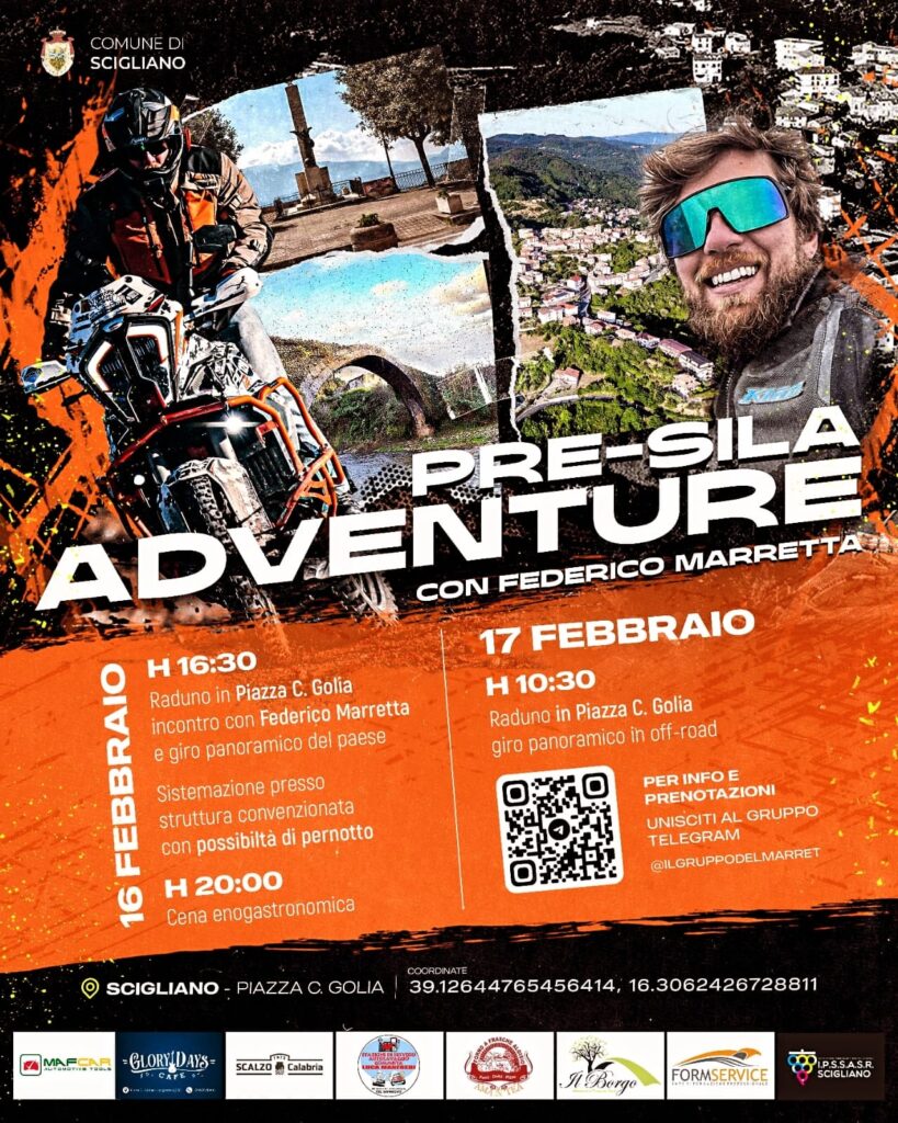 Per portare maggiore visibilità all’evento, ha accettato di partecipare, Federico Marretta, ex pallavolista professionista di livello internazionale, motoviaggiatore, produttore cinematografico, creatore di contenuti con oltre 100mila seguaci sui vari social network e ambasciatore per KTM Italia. Lo stesso è solito raccontare i propri viaggi tramite i suoi canali social, riscuotendo un ampio successo in termini di visualizzazione, cosa che sicuramente avverrà anche per il Pre Sila Adeventure, così promuovendo nel migliore dei modi Scigliano e l’evento e raduno motoristico.