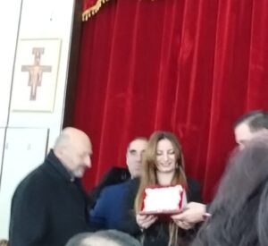 Infine, premio alla memoria a Peppina Curcio (Terziaria Francescana di Cropani) “Mistica dell’Eucaristia”. Ha ritirato il riconoscimento dalle mani dell’Arcivescovo la Ministra del Terz’Ordine Francescano Rita Innocente, che ha ricordato Peppina Curcio e l’attività delle Terziarie iscritte per mantenere viva la fede nel nostro paese, in un momento difficile dal punto di vista sociale. Nonostante il suo desiderio di consacrarsi suora missionaria, Peppina Curcio dovette presto rinunciare per la malattia che la vide sofferente ma felice, poiché offrì tutto al Signore con umile rassegnazione e senza mai lamentarsi. Innamorata dell’ideale Francescano, con un cilicio nascosto sotto le umili vesti si recava tutte le mattine al Convento dei Frati Cappuccini e diventò Terziaria. Morì all’età di 25 anni.