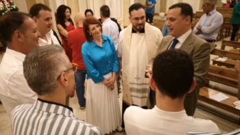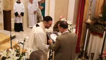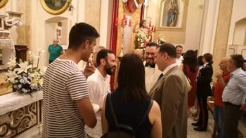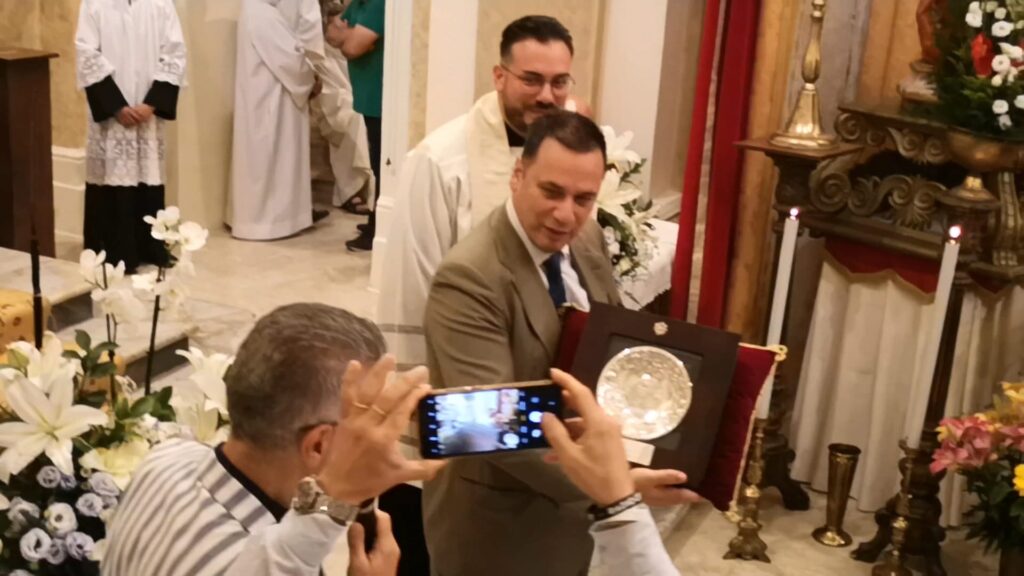 Il parroco don Roberto Tomaino ha salutato Monda, affermando: “ho voluto fortemente oggi qui con noi perché stiamo parlando di una persona di spicco del mondo mediatico e il suo sapiente esercizio della professione, infarcito di ironia e riflessioni profonde sul mondo della comunicazione e della letteratura che ogni giorno viviamo e che se non gestito con profonda saggezza, può diventare estremamente pericoloso”. Il parroco ha effettuato la consegna del piatto d’argento griffato Gerardo Sacco, prima di dare la parola ad un Andrea Monda visibilmente emozionato.