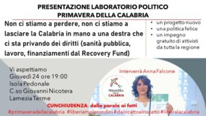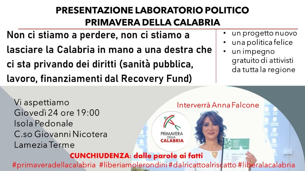 Domani sera, a partire dalle ore 19 presso l’isola pedonale di corso G. Nicotera a Lamezia Terme, verrà presentato ufficialmente il laboratorio politico “Primavera della Calabria”. All’evento sarà presente anche la responsabile regionale, Anna Falcone.