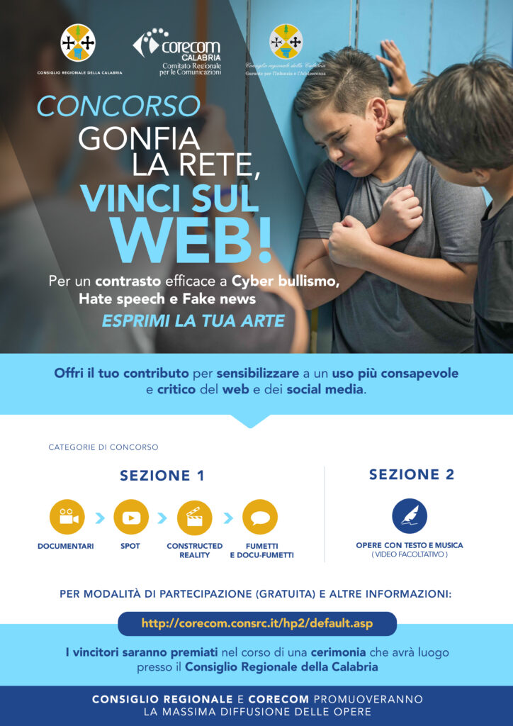 Consiglio regionale della Calabria, Co.re.com. e Ufficio del Garante per l’infanzia e l’adolescenza, su impulso del Co.re.com., hanno varato un’iniziativa per contribuire ad un utilizzo consapevole del Web, e dei social media in particolare, e per contrastare i fenomeni dell’Hate speech (linguaggio d’odio), delle fake news (disinformazione) e del cyber bullismo (bullismo su internet).