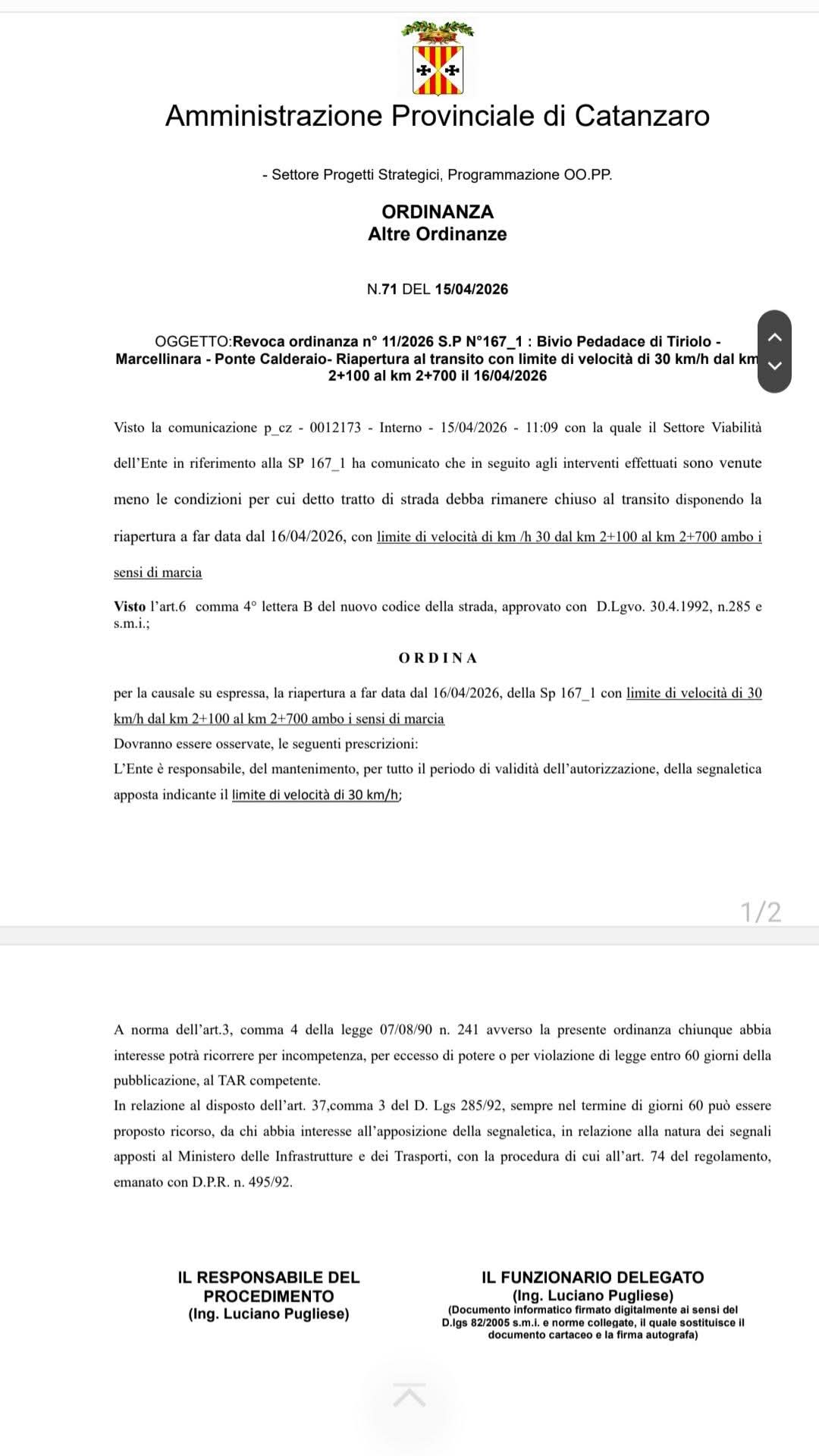 Revoca ordinanza n 11/2026 S.P N167/1: Bivio Pedadace di Tiriolo – Marcellinara – Ponte Calderaio– Riapertura al transito con limite di velocità di 30 km/h dal km 2+100 al km 2+700 dal 16/04/2026.