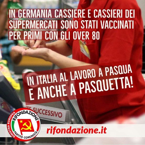 Rifondazione Comunista chiede ai Presidenti delle Regioni di emanare immediatamente ordinanze per la chiusura degli esercizi commerciali a Pasqua e Pasquetta* come era stato fatto l’anno scorso. Ma soprattutto chiediamo che *commesse/i vengano vaccinate/i subito!*