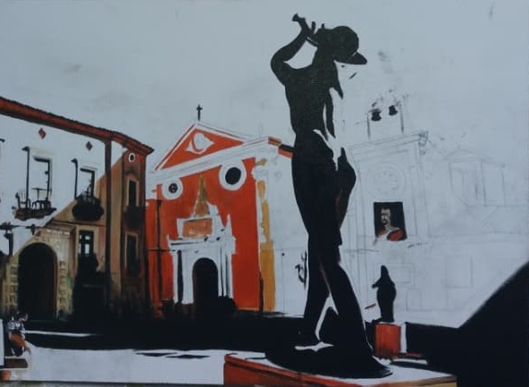 Ho utilizzato due stili di pittura una di tipo classico realista l’altra moderna stilizzata digitalmente, richiamando il concetto di continuità e contemporaneità, un connubio, tra passato è presente. Ho sottovalutato i tempi di esecuzione dell’opera consegnandola pittoricamente incompleta.