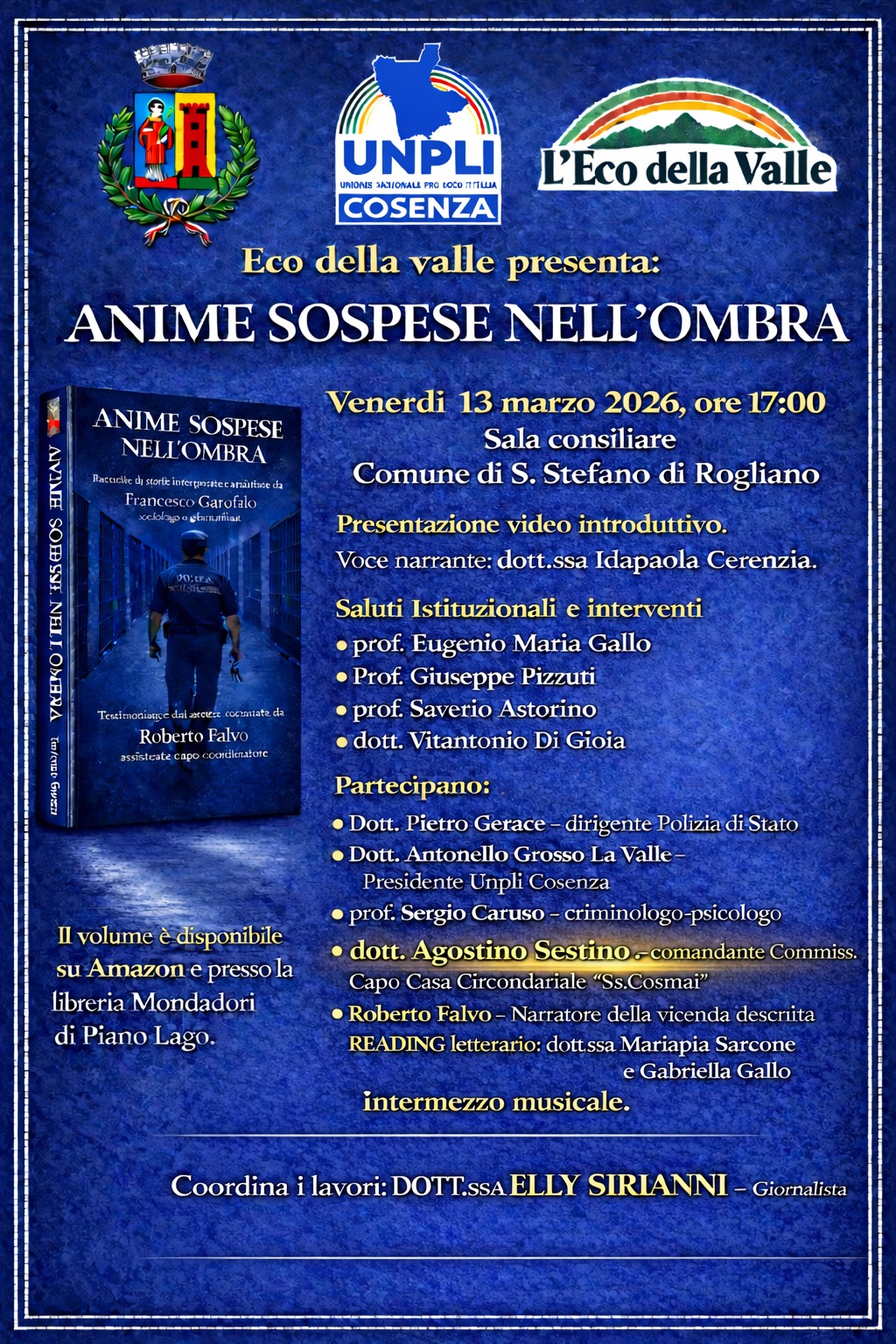 Durante l’incontro, dopo il video introduttivo con la voce narrante della dottoressa Ida Paola Cerenzia, sono previsti i saluti istituzionali e gli interventi dei professori Eugenio Maria Gallo, Giuseppe Pizzuti, Saverio Astorino e del dottor Vitantonio Di Gioia. Seguiranno le relazioni del dottor Pietro Gerace, dirigente della Polizia di Stato, del dottor Antonello Grosso La Valle, presidente UNPLI Cosenza, del professor Sergio Caruso, criminologo e psicologo, del dottor Agostino Sestino, comandante commissario capo della Casa circondariale “Cosmai”, e dello stesso Roberto Falvo, narratore delle vicende raccontate nel libro. I lavori saranno coordinati dalla giornalista Elly Sirianni.