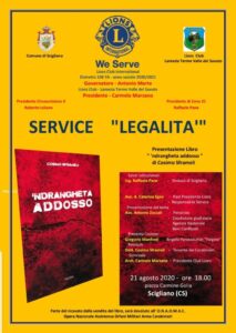 Nella giornata di venerdì 21 agosto, alle ore 18:00, presso la piazza Carmine Golia sita nel comune di Scigliano (CS), il Lions Club Lamezia Terme Valle del Savuto – si legge in un comunicato – ha organizzato e promosso la presentazione del libro “Ndrangheta addosso” di Cosimo Sframeli, Tenente dei Carabinieri e Paracadutista, ora Comandante/Insegnante di plotone presso la Scuola Allievi Carabinieri di Reggio Calabria. La presentazione del testo rientra nel vasto ambito dei service dedicati alla Legalità che l’associazione Lions svolge in numerose occasioni ed è stata, per il Lions Club Lamezia Terme Valle del Savuto, il primo service dell’anno sociale 2020/2021, iniziato ufficialmente il 1 luglio 2020.