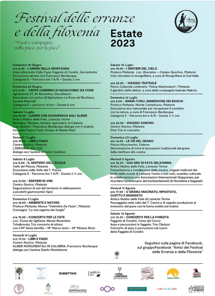 Il nostro festival nasce nella primavera del 2018 per volontà della Pro Loco di Platania guidata da Paolo Nicolazzo. Fu chiesta la collaborazione di Francesco Bevilacqua, il quale consigliò di non limitarci ad un solo paese, ma di creare una “rete” comprensoriale di comuni e di associazioni dell’area del Reventino-Mancuso, della quale Francesco si era a lungo occupato, dapprima proponendo l’istituzione di un parco regionale e poi pubblicando un libro dal titolo “Il Parco del Reventino, guida storico-naturalistica ed escursionistica al gruppo dei monti Mancuso, Reventino, Tiriolo e Gimigliano” (Rubbettino 2008). Nello stesso tempo Francesco individuò il titolo: “Festival delle Erranze e della Filoxenia”. Furono contattate e più volte sollecitate tutte le associazioni e le pro loco del territorio. Quelle che accettarono l’invito si misero insieme e diedero vita alla prima edizione l’estate del 2018. L’esperienza è proseguita negli anni successivi e viene riproposta anche quest’anno.