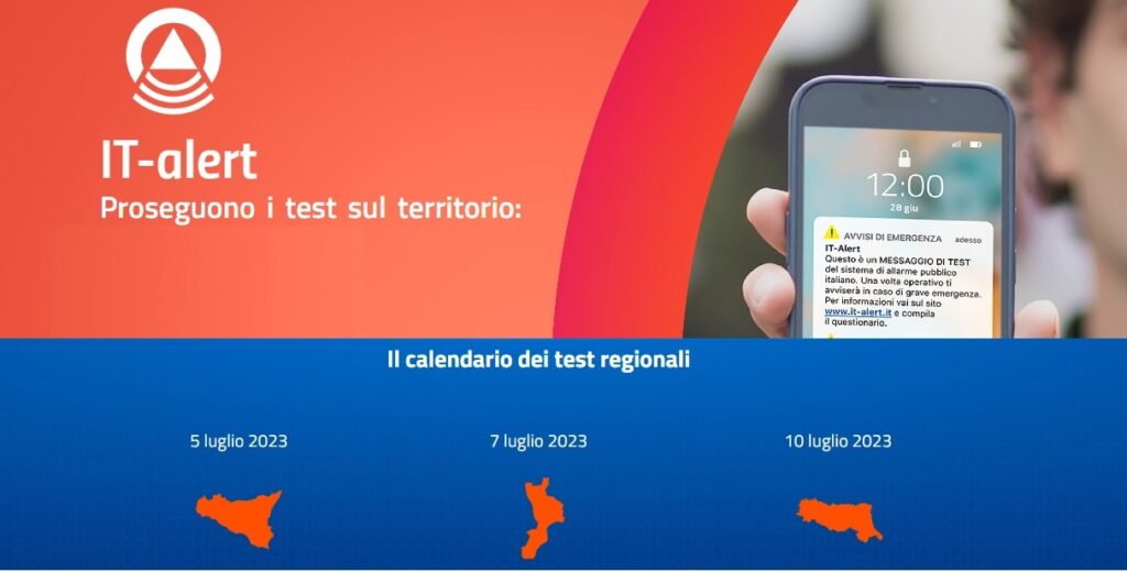 Il sistema di allarme nazionale comunica che in Calabria il prossimo venerdì 7 luglio 2023, alle ore 12,00 è previsto il test di sperimentazione dell’innovativo sistema It-alert, la nuova strutturazione di allarme pubblico che servirà ad avvertire la popolazione di una determinata area geografica di un’emergenza climatica in arrivo o una catastrofe naturale in corso, per il quale la Calabria risulta regione capofila, insieme a Sicilia, Toscana, Sardegna ed Emilia Romagna, nella sperimentazione organizzata dal dipartimento nazionale di Protezione Civile di It-alert.