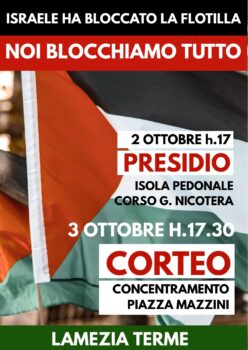 Nella tarda serata dell’1 Ottobre la Global Sumud Flotilla è stata attaccata dalla marina militare israeliana mentre tentava di avvicinarsi alle acque palestinesi. Un’aggressione criminale contro una missione umanitaria che si poneva come unico obiettivo quello di rompere il blocco navale illegale e consegnare aiuti umanitari alla popolazione palestinese. Mentre l’USB ha lanciato lo sciopero generale per il 3 ottobre anche a Lamezia Terme si terranno due momenti di piazza: – Giovedì 2 ottobre a partire dalle 17:00 presidio nell’area pedonale di Corso Giovanni Nicotera; – Venerdì 3 ottobre corteo cittadino con concentramento alle 17:30 in Piazza Mazzini. È arrivato il momento di trasformare le parole in azioni: hanno bloccato la Flotilla, adesso blocchiamo tutto!