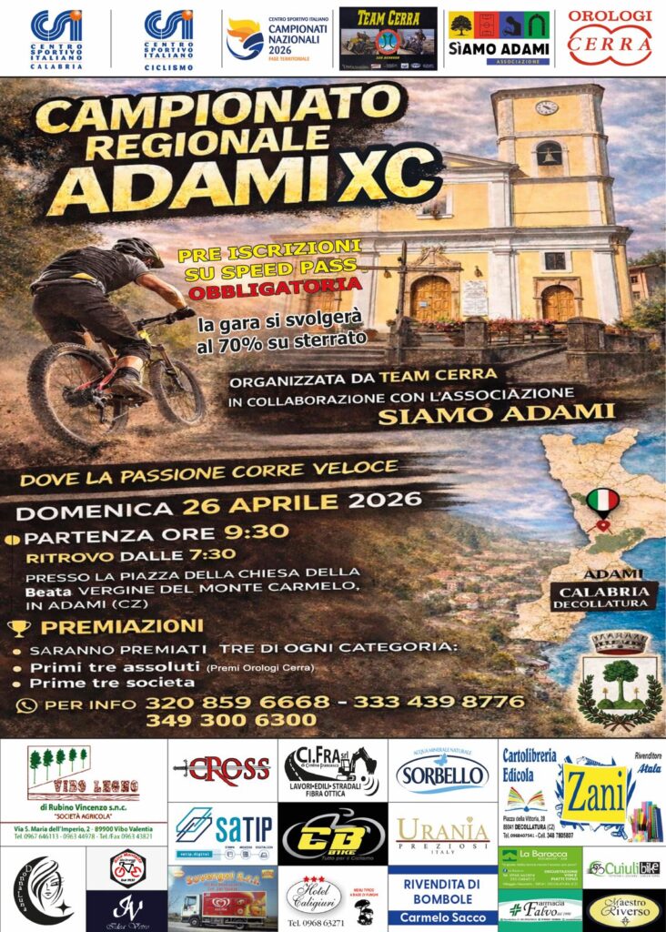 Si svolgerà domani, domenica 26 aprile 2026, sul nuovissimo e ancora immacolato tracciato di Adami, piccola frazione di Decollatura, estremamente suggestivo per i luoghi attraversati e l’alternarsi di sterrato e asfalto sul circuito, la gara di Mountain Bike Cross Country, tappa del campionato regionale under 44 e over 45 del “Calabria Bike Tour 2026”, torneo organizzato dal Centro Sportivo Italiano.