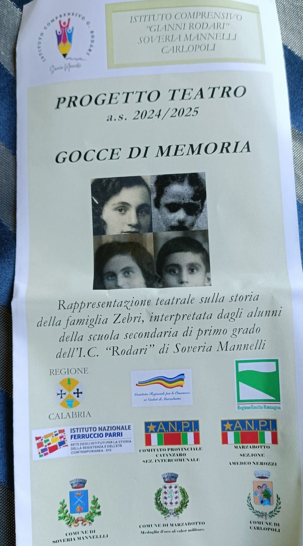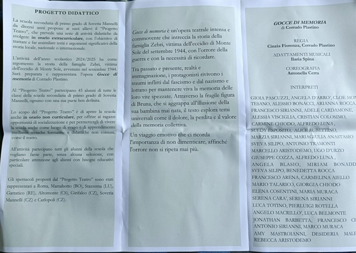 Come anticipato dalla nostra testata qualche settimana fa, gli alunni dell’Istituto Comprensivo “Rodari” di Soveria Mannelli, a cavallo tra la fine di aprile e l’inizio di maggio, sono saliti in Emilia Romagna per la “prima” del nuovo spettacolo teatrale 2025 con tema la strage di Marzabotto e, in particolare, quella della famiglia Zebri.