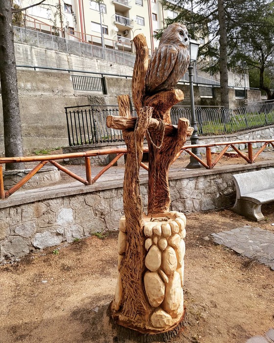 “Il pozzo: simbolo della purificazione e della rinascita – spiega l’autore, architetto di 31 anni – e per alcuni fonte di vita e luogo di interazioni sociali. La civetta: emblema della saggezza e della conoscenza, in riferimento alla Dea Atena per gli antichi greci. Simboli entrambi che rievocano la socialità con la speranza che il luogo in cui sorgono ne diventi il fulcro per la comunità”. In meno di una settimana, utilizzando una motosega tecnica, dal tronco di un albero tagliato dal Comune perché pericolante, è stata ‘forgiata’ dal legno l’immagine che adesso accoglie in visitatori nell’area verde urbana anticamera del borgo che diede i natali a Mattia Preti.