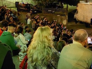 Le gradinate sono fitte di persone grandi e di ragazzi. Si vedono anziani, mamme giovani con bimbi in carrozzelle, ragazzi di varie età. Si capisce che son arrivati noni, nonne, genitori, familiari e conoscenti.