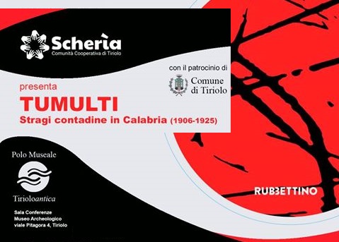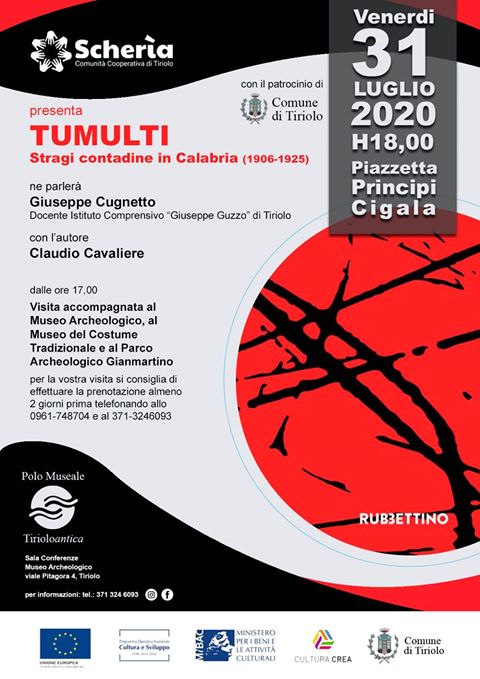 Tiriolo – Conferenza di presentazione – “Tumulti, stragi di contadini in Calabria (1906-1925)” è il titolo dell’ultimo libro del sociologo lametino, Claudio Cavaliere che sarà presentato a Tiriolo venerdì 31 luglio 2020 alle ore 18,00 in piazzetta Principi Cigala, organizzata dalla Cooperativa Scherìa.