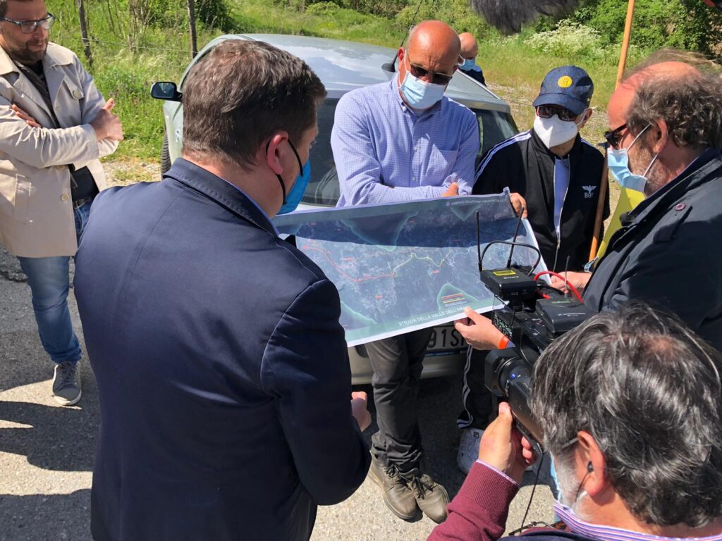 «Sì Tv7 si occupa ancora una volta della problematica della strada che non c’è. Infatti abbiamo avuto il piacere e l’onore di avere con noi uno dei uno dei giornalisti di spicco della nostra regione, Riccardo Giacoia, presso il tratto di strada realizzato di 4 km ed il restante tratto in parte in corso d’opera e l’altro ancora da tracciare.