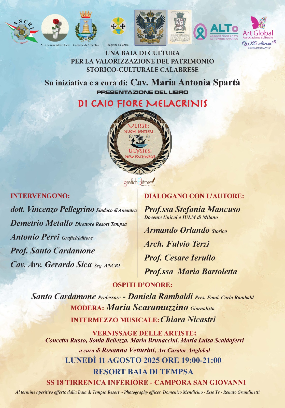 L’evento culturale è ideato e promosso dalla cav. Maria Antonia Spartà con la finalità di valorizzare il patrimonio storico-culturale calabrese. Interverranno: Il cav. avv. Gerardo Sica, segretario Ancri; Demetrio Metallo, direttore del Resort Tempsa; il sindaco di Amantea Vincenzo Pellegrino; l’editore Antonio Perri,