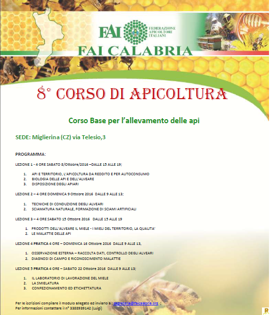 Un’occasione di occupazione come professione, ma anche di eventuale integrazione per quanti già operano in agricoltura, viene fornita dal FAI-Calabria (la Federazione Apicoltori Italiani) che propone l’ottavo corso di apicoltura. Per apprendere e migliorare le tecniche di allevamento delle api viene offerta la possibilità di partecipare ad un corso, aperto ai principianti e ai già esperti operatori, per praticare l’apicoltura.