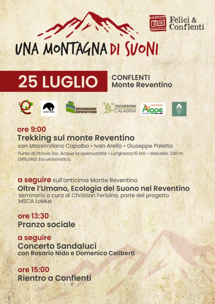 Con questi obiettivi torna per la decima edizione di Felici & Conflenti l’appuntamento con “Una montagna di suoni”, il trekking sul monte Reventino, realizzato in collaborazione con numerose realtà attive sul territorio come Conflenti Trekking, Discovering Reventino ed Edrevia, in programma domani, 25 luglio, a partire dalle ore 09:00.