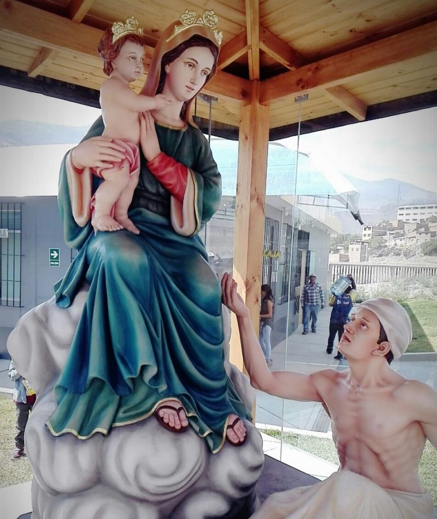 Il gruppo statuario peruviano è stato realizzato da un artista locale esclusivamente in base alle immagini fotografiche messe a sua disposizione. La bravura dell’artista è stata veramente grande persino per la fedeltà ai particolari inventati a fine ottocento da un bravo scultore ligneo di Napoli, un tal Cocchiara, e poi ripresi dalla più recente statua replicata dal Perathoner di Ortisei (BZ) e benedetta da Papa Paolo Sesto nella basilica di San Pietro in Vaticano, dopo l’incendio avvenuto domenica 25 agosto 1963 di quella originaria napoletana.