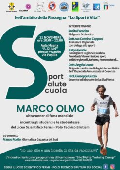 L’appuntamento silano, però, non finisce qui. Infatti lunedì 11 novembre, a partire dalle 10, il Training Camp si sposterà a Cosenza presso l’aula magna «A. De Iuri», dove Olmo incontrerà studentesse e studenti del Liceo Scientifico Fermi – Polo Tecnico Brutium (istituto di ragioneria con curvatura Managnent dello Sport) e terrà un convegno su Sport, Salute e Scuola. All’incontro parteciperanno anche autorità del mondo scolastico: la dirigente Rosita Paradiso; del mondo politico: Dott.ssa Caterina Capponi, assessore regionale con delega allo sport e Katya Gentile, consigliere regionale e presidente VI commissione sport, politiche giovanili, turismo e risorse naturali; medico: il Dott. Angelo Leone, dirigente medico di cardiologia interventistica all’ospedale Annunziata di Cosenza e, infine, l’ideatore della Sila3Vette, il prof. Giuseppe Guzzo. Coordinerà i lavori il giornalista di Gazzetta del Sud, Franco Rosito.
