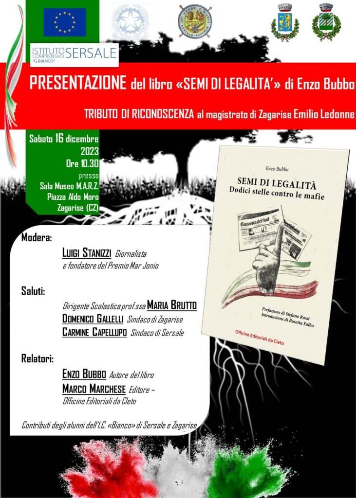 Enzo Bubbo, professore di lettere, giornalista e scrittore, presenta il suo primo libro Semi di legalità, un saggio pubblicato da Officine Editoriali da Cleto, responsabile l’editore Marco Marchese, con una prefazione del noto pedagogista Stefano Rossi e l’introduzione della dirigente scolastica Rosetta Falbo.